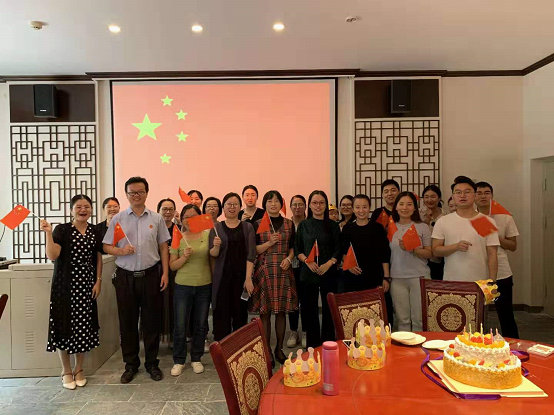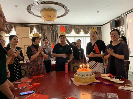 本次集体生日活动共分两个环节。第一环节,到场教职工与国旗合影,向“中华人民共和国成立70周年”献礼,祝福祖国繁荣昌盛。第二环节,大家齐唱生日快乐歌,为九月份过生日的老师们送祝福。之后,老师们分发蛋糕,共同分享生日喜悦。集体生日活动在欢快的“生日快乐歌”中落下帷幕。