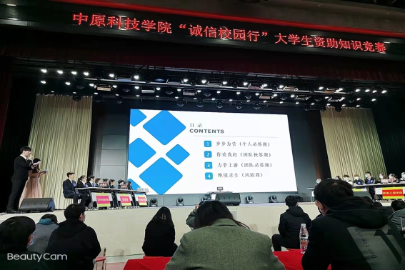“诚实守信、知恩感恩、自立自强、勇于担当”。12月9日下午18:30,由中原科技学院学生工作处主办,土木建筑工程学院承办的中原科技学院“诚信校园行”大学生资助知识竞赛在健行馆正式拉开序幕。商学院代表队与其他学院的六支队伍“狭路相逢”,吸引了许多同学前来观看。