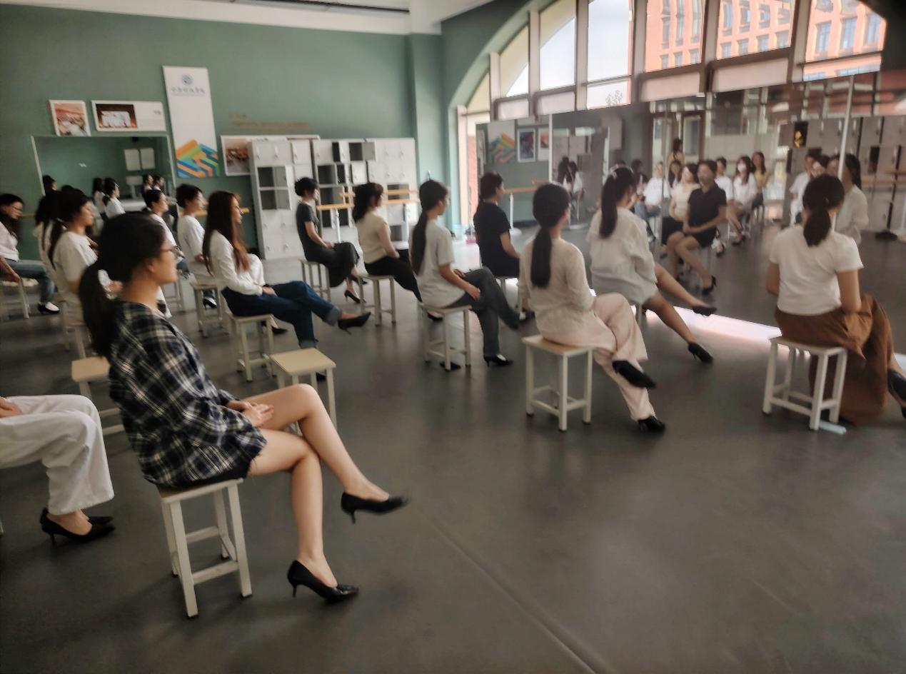 该队伍具有一支专业的师资团队,在日常训练中,礼仪指导总负责人贾斐斐老师针对礼仪基本站姿、坐姿、走姿以及蹲姿进行了教授,并帮助同学们一一纠正。例如在礼仪接待时,女生应双手五指并拢,保持右手在上、左手在下,高度合适的手位,关节位置有一定弯度;双脚或并拢,或v字站立,或丁字站立,面带微笑,双肩下压,不可晃动;左侧入座、左侧出,上半身挺直,扶裙时注意仪态;双臂自然前后摆动,双脚脚跟踩在一条线上;或高低式蹲姿,或交叉式蹲姿。