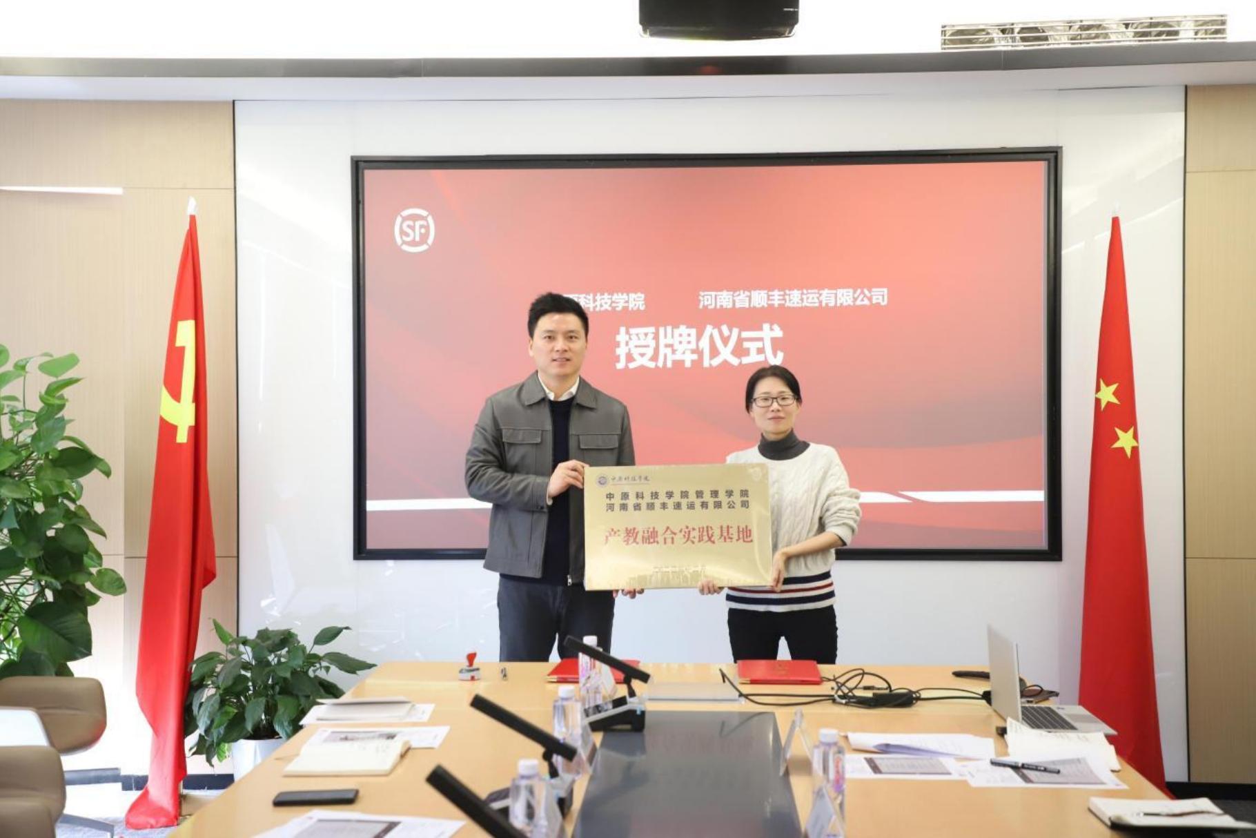 2024 年 12 月 9 日,中原科技学院管理学院与河南省顺丰速运有限公司校企 合作基地战略协议书签约仪式在河南省顺丰速运有限公司会议室顺利举行。中原 科技学院经管学部副部长兼管理学院院长赵芳鋆、管理学院党总支书记马鹏辉、 校地合作处副处长朱伟、管理学院办公室主任唐朝晖、管理学院物流管理教研室 主任郭卫萍、管理学院物流管理教研室专任教师吴银平以及顺丰速运河南区人力 资源部负责人李军伟、人才生态与供应链负责人刘静、市场销售部市场组负责人 胡光辉、招聘经理王典、市场销售部校园场景负责人吴圆圆以及顺丰科技技术集 团行业科技中心高级顾问潘迪华(线上)参加签约及授牌仪式。签约及授牌仪式 由顺丰速运河南区招聘经理王典主持。
