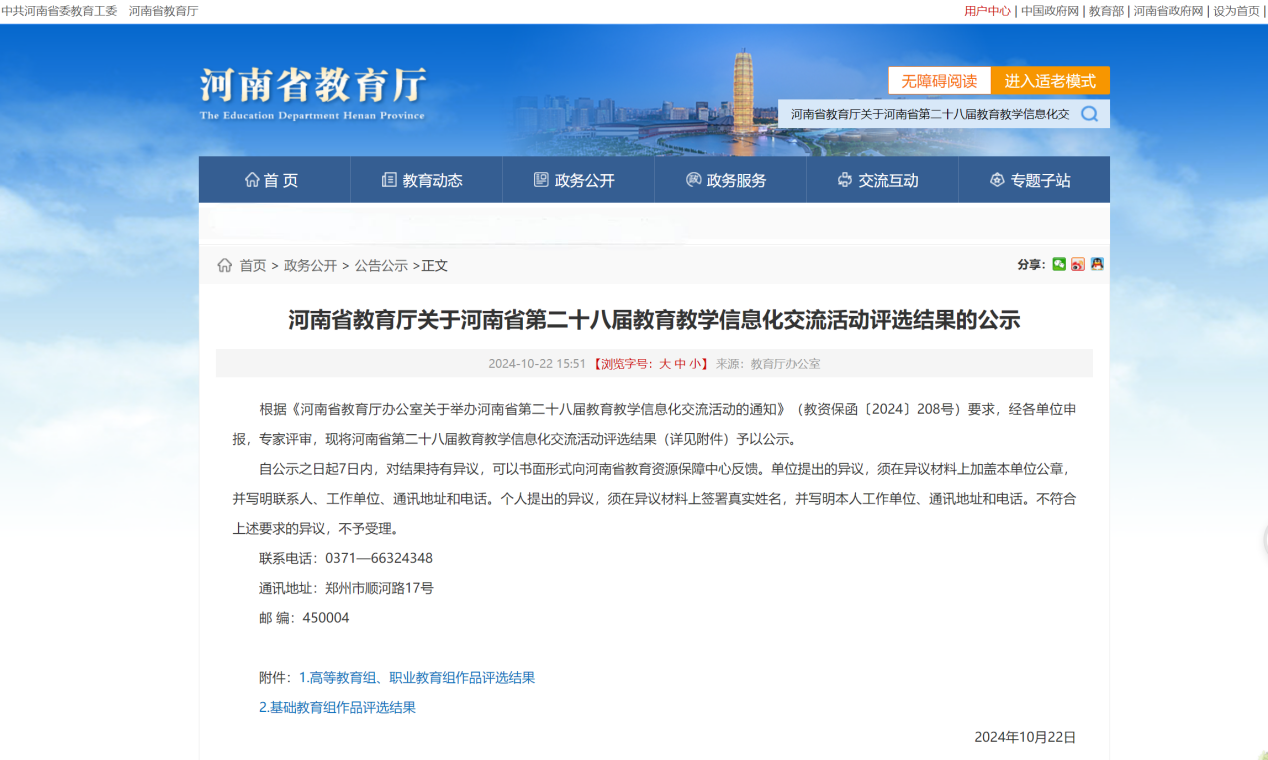 近日,从省教育厅获悉,在全省第二十八届教育教学信息化交流活动中,我校共有九项作品获奖,其中,我院赵芳鋆老师凭借其作品《旅游景点诗文鉴赏——岳阳楼楹联赏析》脱颖而出,荣获一等奖殊荣。河南省教育教学信息化交流活动不仅是深入贯彻中共中央、国务院《中国教育现代化2035》蓝图及教育部《教育信息化2.0行动计划》的重要实践平台,更是推动我省教育信息化进程的体现。我校始终站在教育现代化的前沿,积极响应国家号召,将信息技术与教育教学深度融合,提升新时代教育质量。我校高度重视并积极组织教师广泛参与此类交流活动,