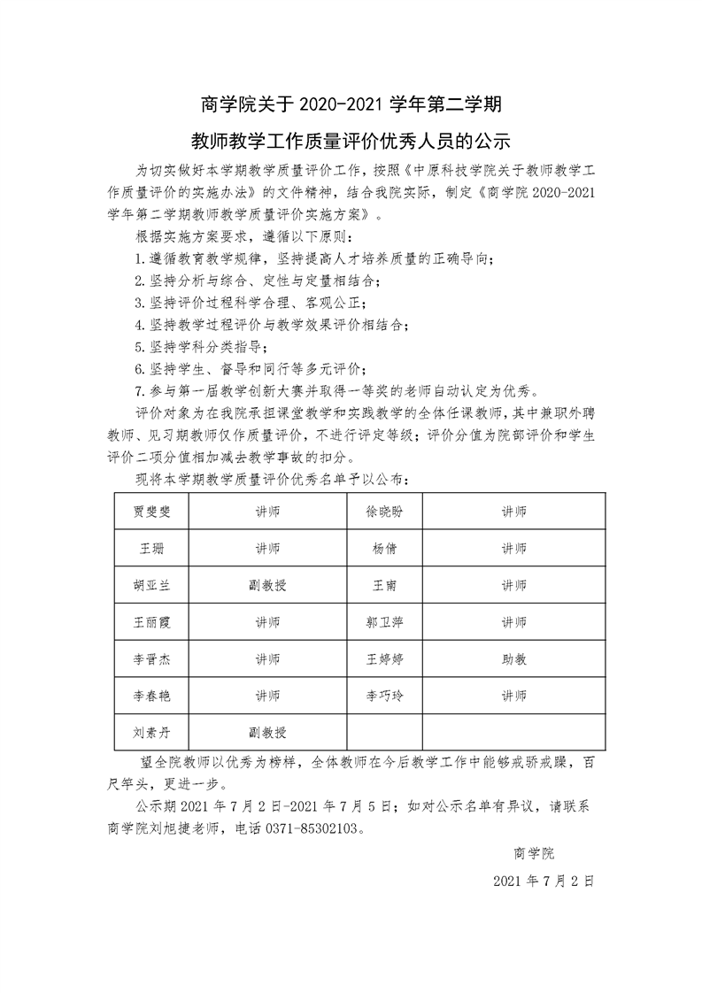 商学院关于2020-2021学年第二学期教师教学工作质量评价优秀人员的公示