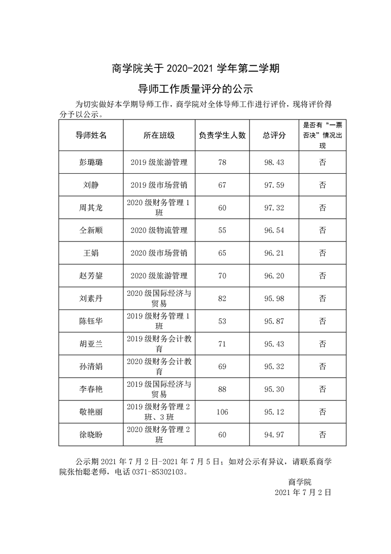 商学院关于2020-2021学年第二学期导师工作质量评分的公示