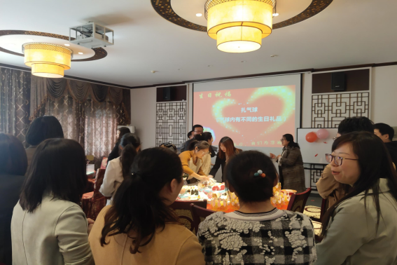 活动分为两个环节。第一环节,送祝福。到场领导、老师齐唱生日快乐歌,为寿星们送上最美好的祝福。在美妙的歌声中,寿星们共同许愿,一同吹灭生日蜡烛。第二环节,抽奖。本次活动精心准备了气球,每个气球里放有礼品单,待刺破后,方能揭晓答案。礼品虽小,但心意满满。到场的老师们喜笑颜开,脸上洋溢着幸福的微笑。