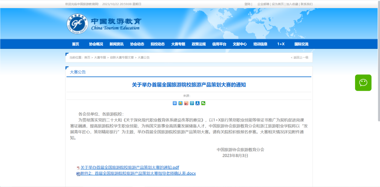为贯彻落实党的二十大和《关于深化现代职业教育体系建设改革的意见》,以1+X旅行策划职业技能等级证书推广为契机促进岗课赛证融通,提高旅游院校学生职业技能,为我国文旅事业高质量发展储备人才,中国旅游协会旅游教育分会和浙江旅游职业学院以“发展青年匠心,策划精彩旅行”为主题,举办了首届全国旅游院校旅游产品策划大赛。