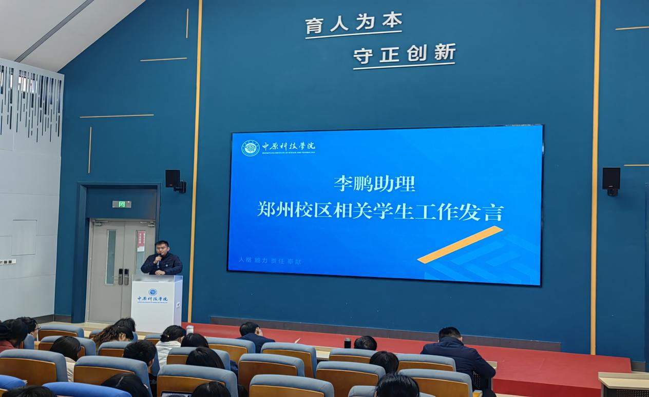 李鹏助理就郑州校区相关学生工作进行了发言,对本学期郑州校区的学生工作进行了总结,对学生工作队伍的各项工作给予了充分肯定,围绕本学期学生安全教育、关爱特殊群体、切实解决学生困难、加强对学生的心理疏导、考研指导、就业辅导,强化就业保障等重点工作进行了具体的安排和部署。