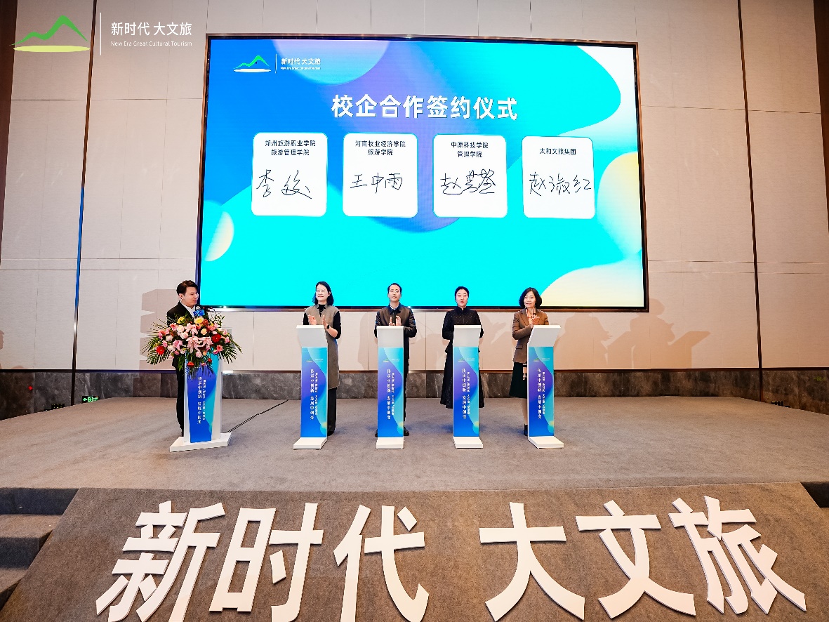 1月5日-6日,由郑州市文化广电和旅游局、郑州市金水区人民政府主办的第五届“新时代 大文旅”论坛在郑州召开,来自全国各地的文旅及相关产业从业者以集中研讨、展示、调研等方式,共话文旅产业未来发展。经管学部副部长、管理学院副院长赵芳鋆,旅游与酒店管理专业老师赵则皓、贾斐斐、王珊应邀参加交流会。我校管理学院与太和文旅集团签署了校企合作协议,同时参加协议签定的还有郑州旅游职业学院旅游管理学院和河南牧业经济学院旅游学院,未来将通过产学研一体化模式共同培育文旅人才,推动文旅产业高质量发展。