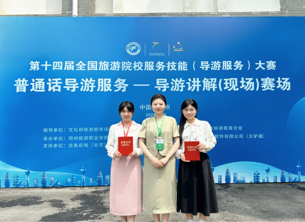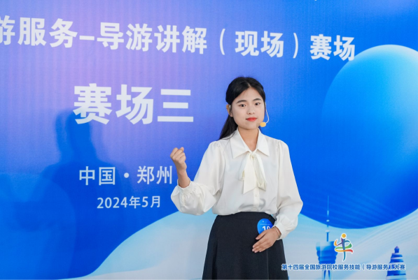 鲜衣怒马少年时,不负韶华行且知。5月23日,第十四届全国旅游院校服务技能(导游服务)大赛在郑州成功举办开幕式,此次比赛由文化和旅游部市场管理司、中国旅游协会指导,中国旅游协会旅游教育分会主办、郑州旅游职业学院承办。来自全国各地298所院校队、883名选手齐聚一堂,在为期3天的比赛中大放异彩。管理学院选派22级旅游管理专业李润雨和20级旅游管理专业苌思佳两名同学,由贾斐斐老师带队参加此次大赛。