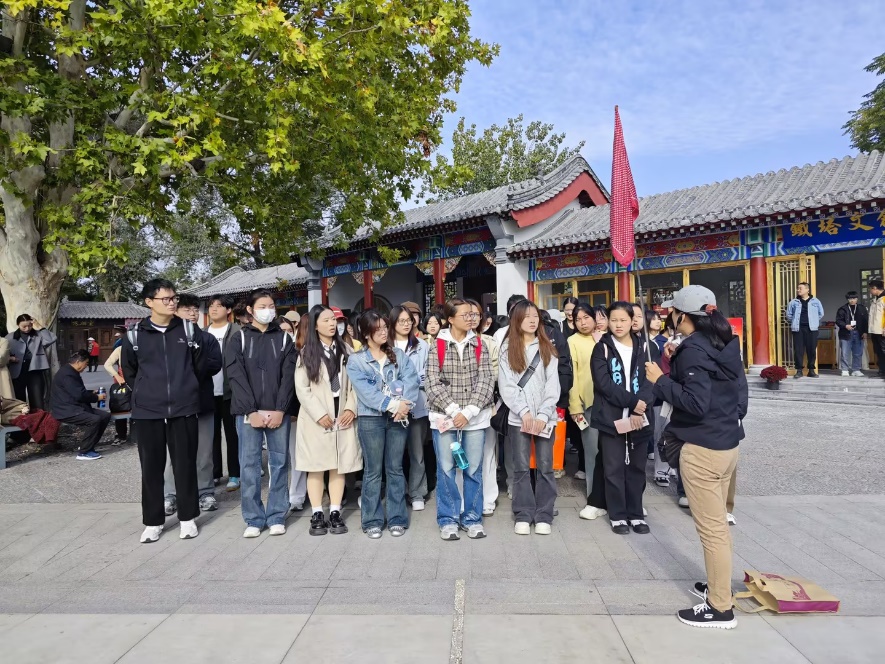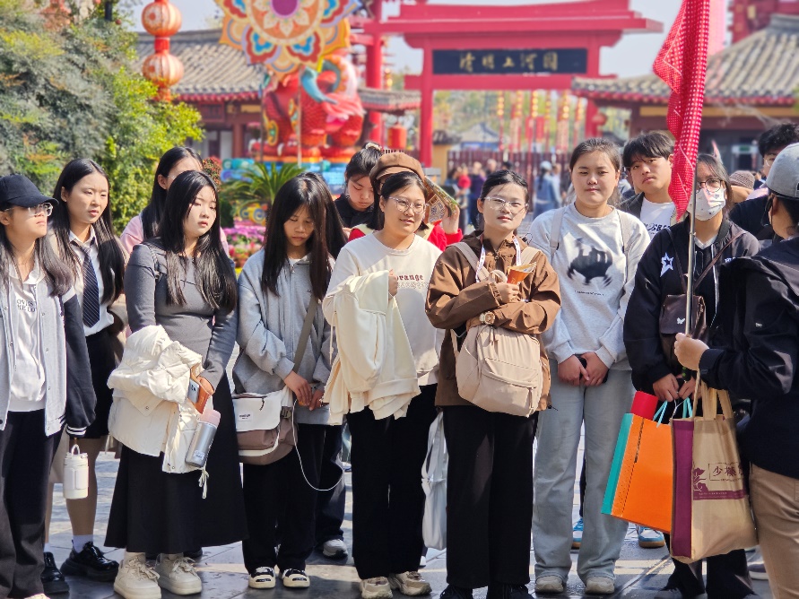第一站首先抵达了开封铁塔景区,开封铁塔作为一座历经岁月沧桑的古老建筑,承载着丰富的历史文化内涵。它始建于北宋时期,以其精湛的建筑工艺和独特的艺术风格闻名于世。导游李海青为学生们详细讲解了开封铁搭的历史渊源,从其建造背景到历经的朝代更迭,从建筑风格的演变到所蕴含的文化意义,李导的讲解如同一幅生动的历史画卷在学生们面前徐徐展开,学生们聚精会神地聆听,不时记录下关键信息,仿佛在与古代的工匠和文人进行着一场心灵的对话。第二站前往开封清明上河园景区,作为国家 5A 级旅游景区,它以独特的宋文化主题和丰富多样的旅游项目吸引着众多游客,使同学们仿佛穿越回了北宋时期的繁华市井。李导为同学们再现了北宋时期的民俗风貌,紧接着同学们跟随李导的脚步感受皇城内庭的神圣,领略皇家园林的美轮美奂,不自觉的对北宋皇城的壮丽发出由衷的赞叹。与此同时,李导深入浅出的讲解让学生们对清明上河园景区有了更直观的认识,同学们认真聆听,不时提问,积极互动,现场学习氛围浓厚。