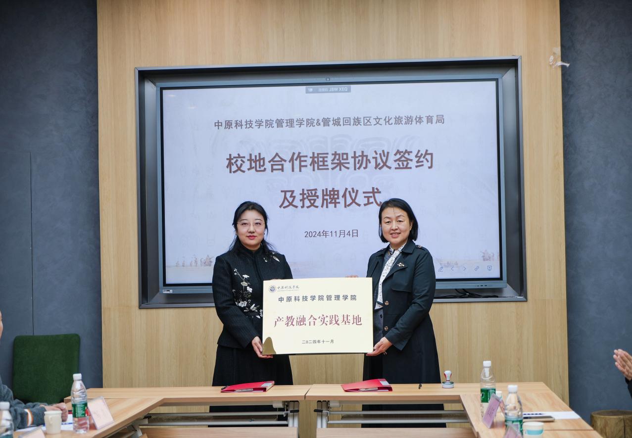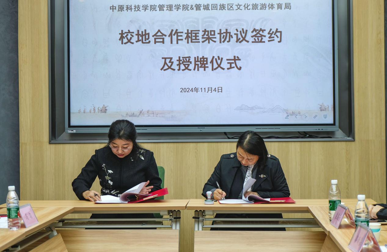 为进一步深化产教融合,促进地方经济发展,培养更多高素质应用型人才,11月4日,中原科技学院管理学院与郑州市管城区文化旅游体育局的校地合作框架协议签约及授牌仪式在郑州商都文化中心举行。郑州市管城回族区文化旅游体育局党组书记、局长李岚,副局长郭新嘉,旅游科科长裴国芳,党建办主任柳茂源,中原科技学院经济与管理学部副部长、管理学院院长赵芳鋆,管理学院党总支副书记赵帅,办公室主任唐朝晖,旅游管理教研室王珊、冯匀、方永芳参加,签约仪式由郑州市管城回族区文化旅游体育局陈浩主持。